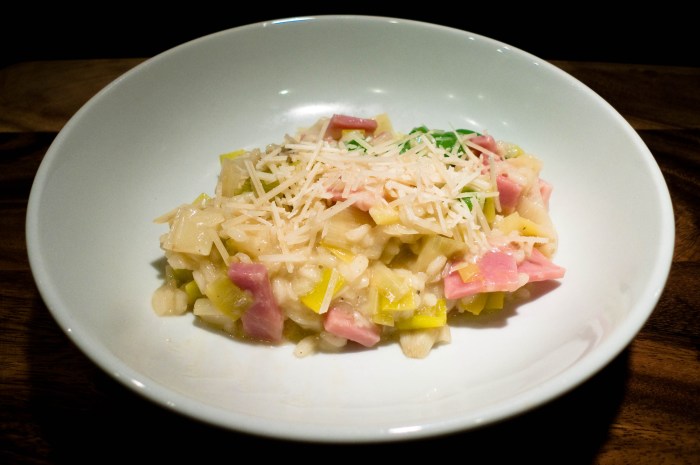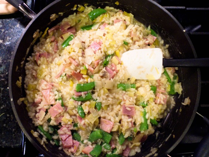 The following recipe is one of my (and Dave’s) favorite risotto preparations – a perfect way to use up some of those holiday ham leftovers.