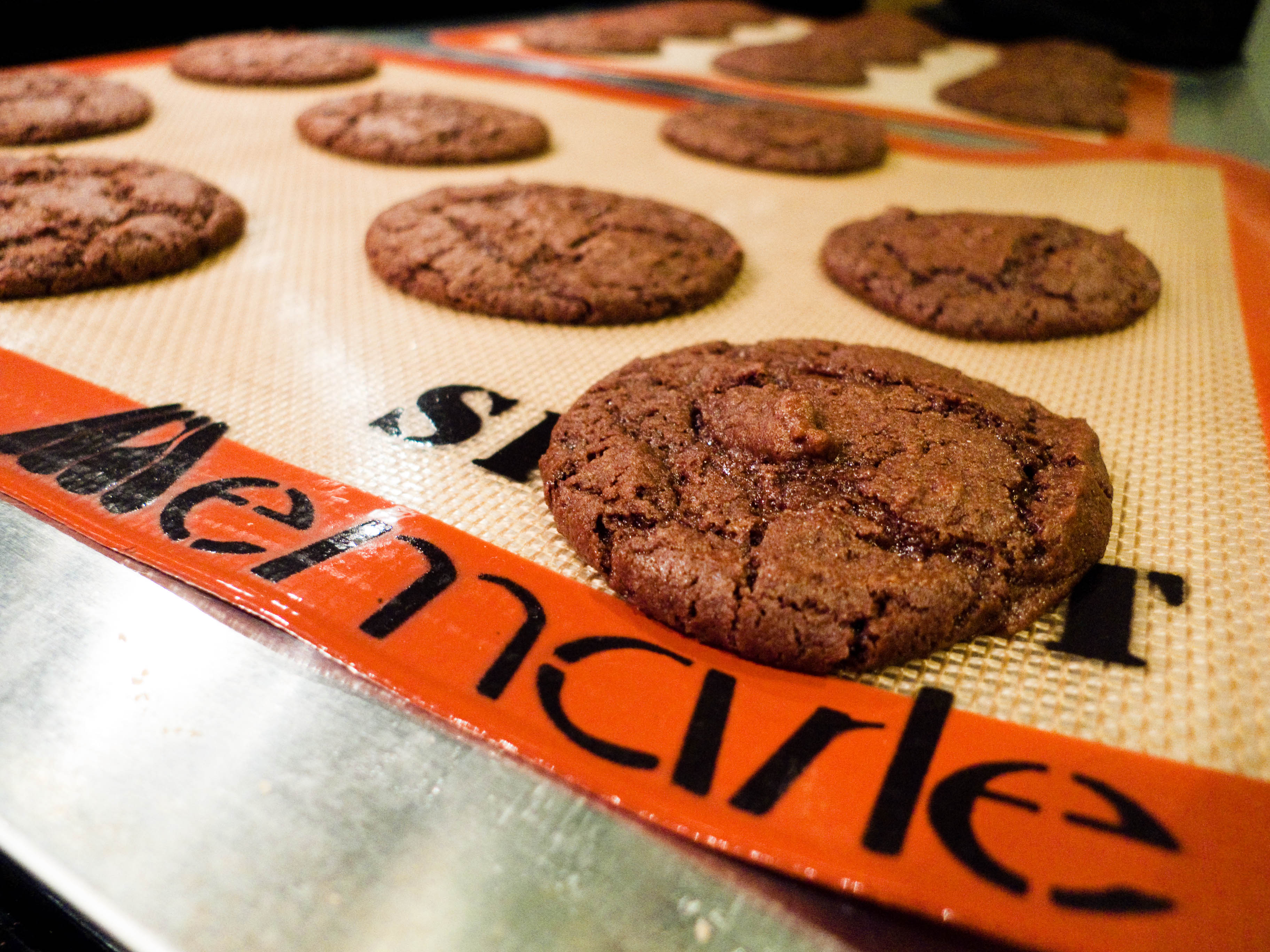 5. Spoon dough (about 2 tablespoons worth) onto Silpat lined baking sheets (if you don’t have a Silpat, spray your cookie sheets with nonstick spray) approximately 2 inches apart.