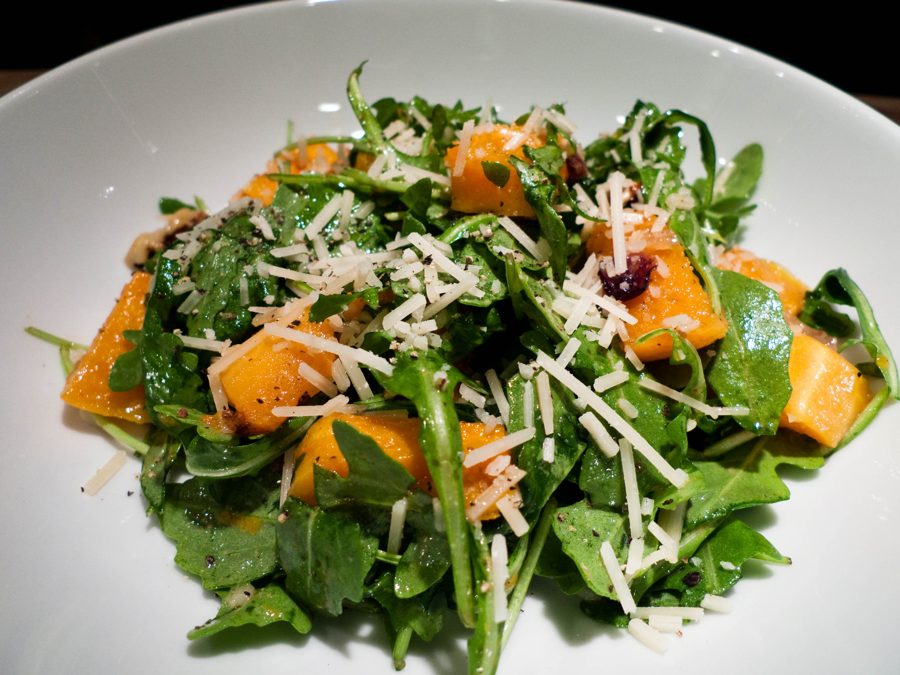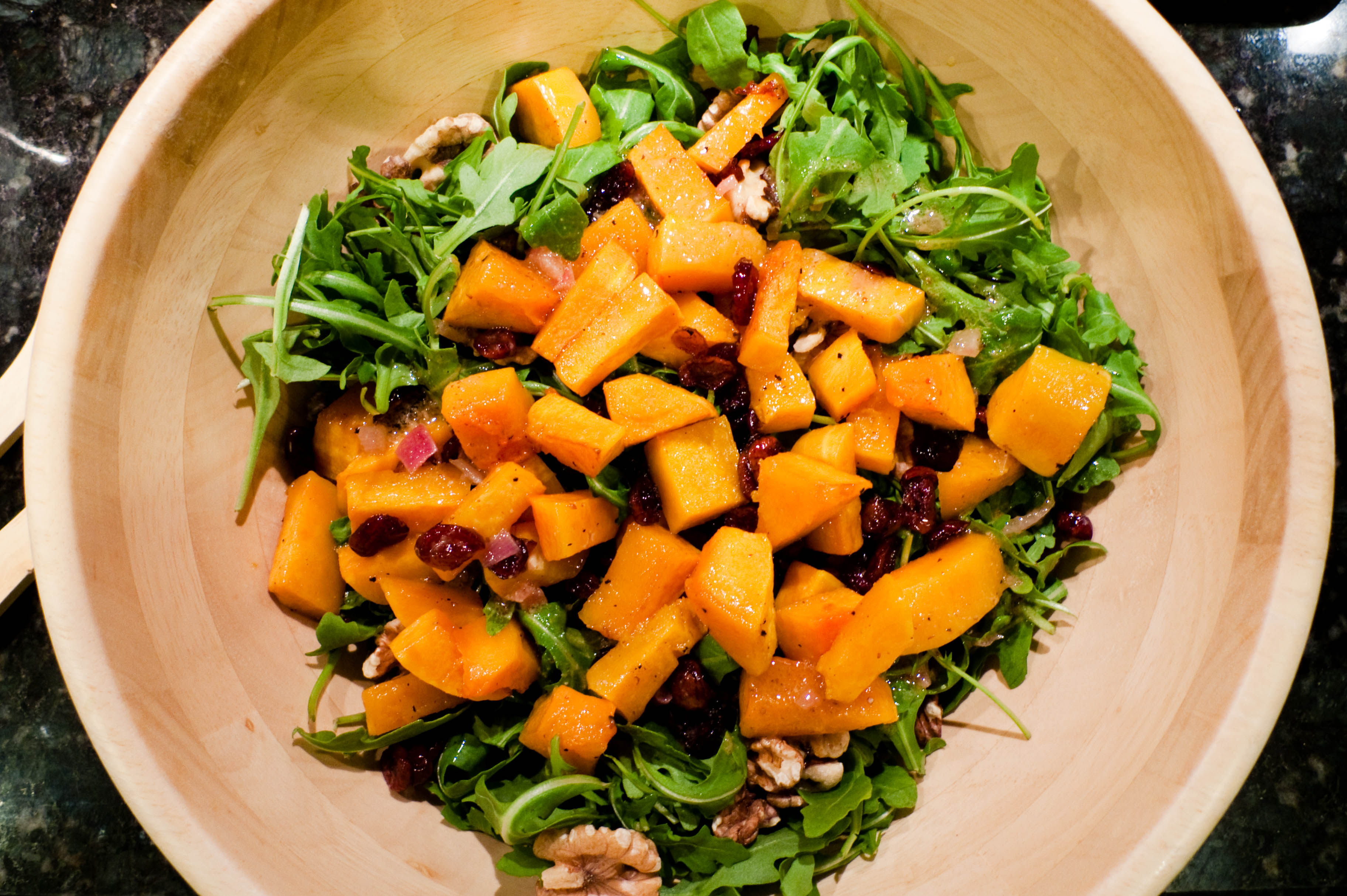 - Place the arugula in a large salad bowl and add the roasted squash mixture, the toasted walnuts, and the grated Parmesan. Spoon just enough vinaigrette (you probably won’t use it all) over the salad to moisten and toss well. Sprinkle with salt and pepper and serve immediately.