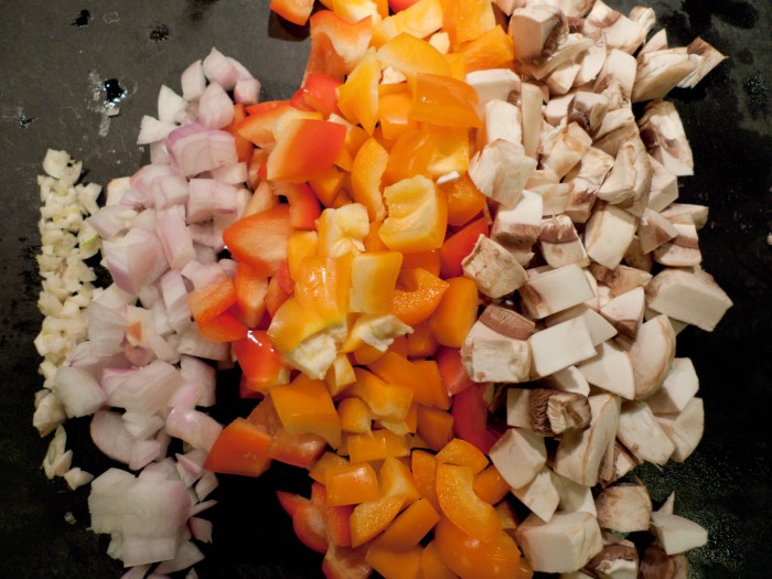 - In the same skillet, cook chopped peppers, shallots and mushrooms in fat leftover from the sausage (add some olive oil if needed) until soft, approximately 3 minutes. Add garlic, paprika, salt and pepper and cook 3 minutes more.