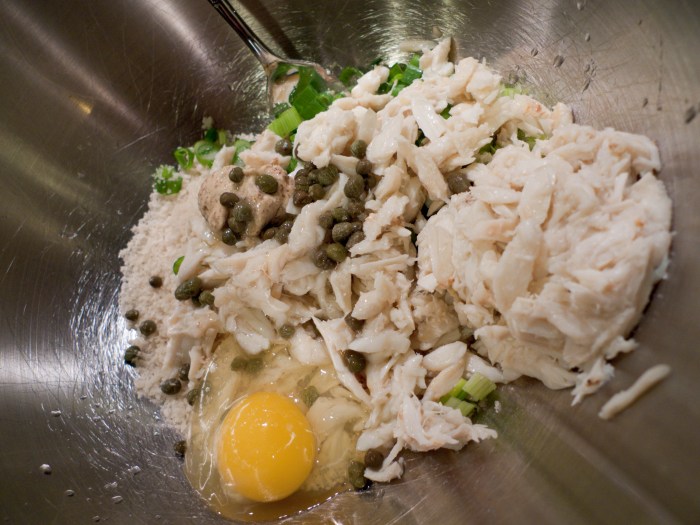 - Combine breadcrumbs, scallions, crabmeat and capers in a large bowl. Add mustard, lemon juice, lemon zest, salt, pepper and egg, stirring to combine.
