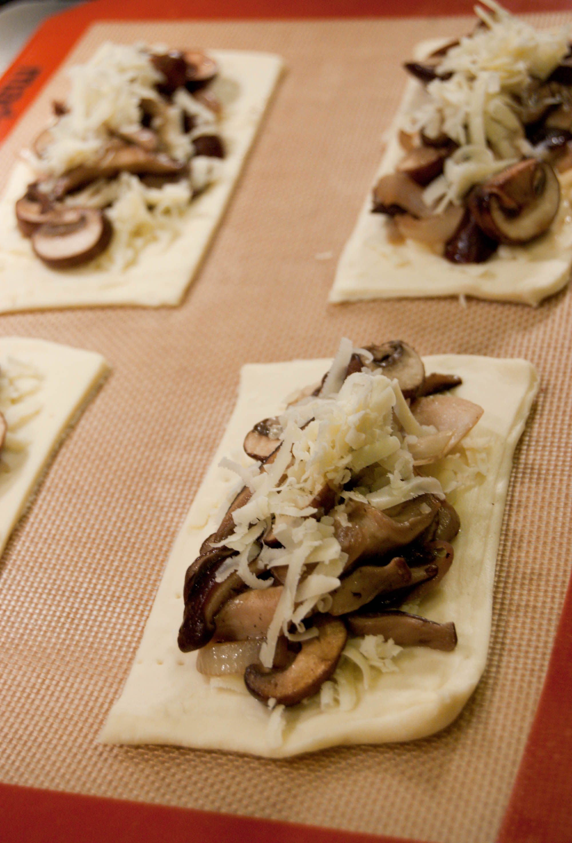 3. Dividing evenly, sprinkle the pastry squares with half the cheese, leaving a ½-inch border on each. Top with the mushroom mixture and remaining cheese. Bake until the pastry is golden brown, 20 to 25 minutes.