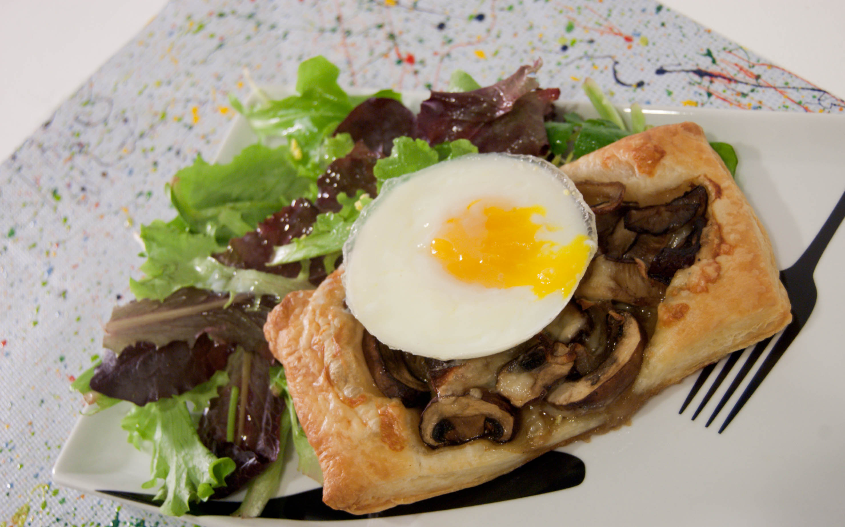 Flaky Mushroom and Gruyere Tarts with Mixed Greens and Poached Eggs