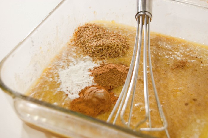 3. Add baking powder, vanilla, ground flax seed, cinnamon, nutmeg and salt directly to the dish and whisk well. Carefully add the milk and stir to combine.