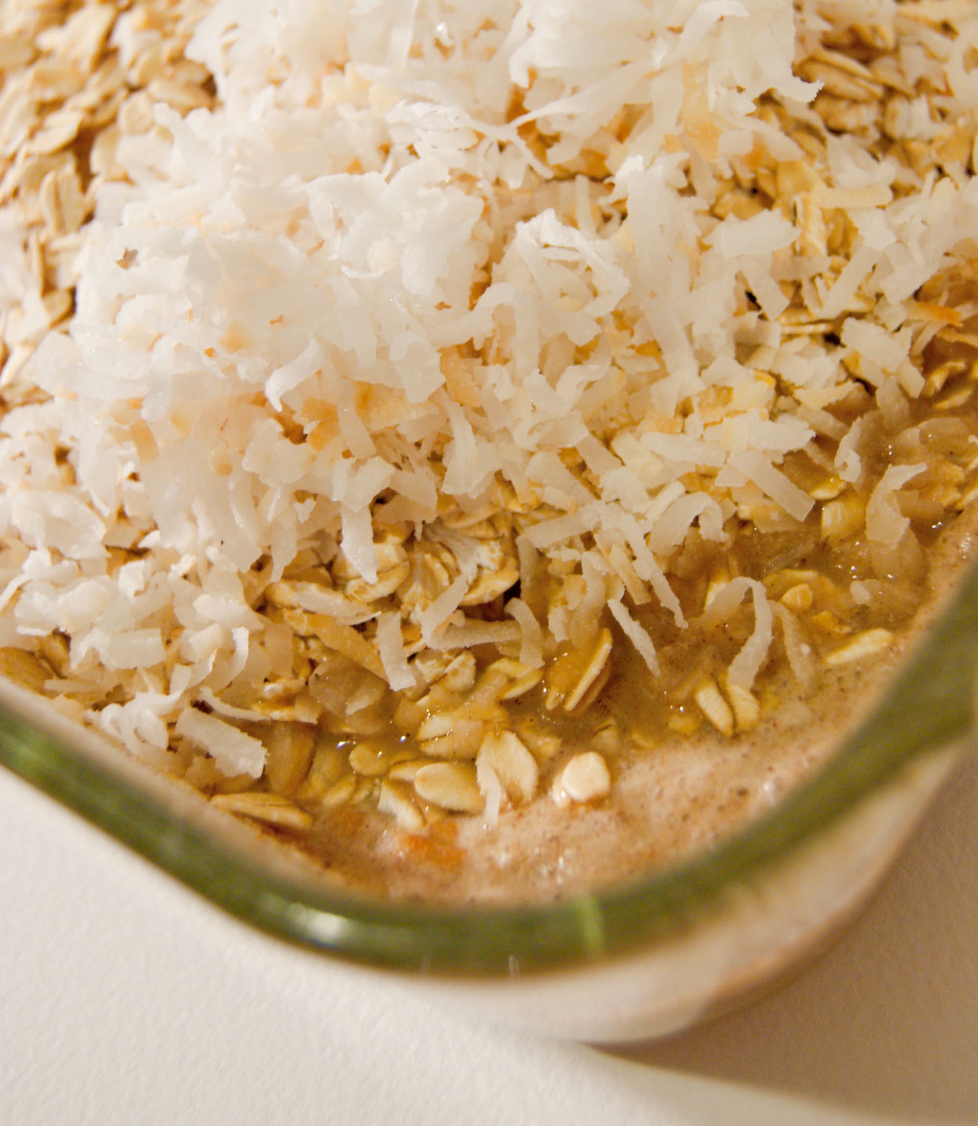 4. Add the toasted coconut and oats and carefully fold into the mixture, making sure everything is combined really well. Cover the dish with plastic wrap and refrigerate over night.