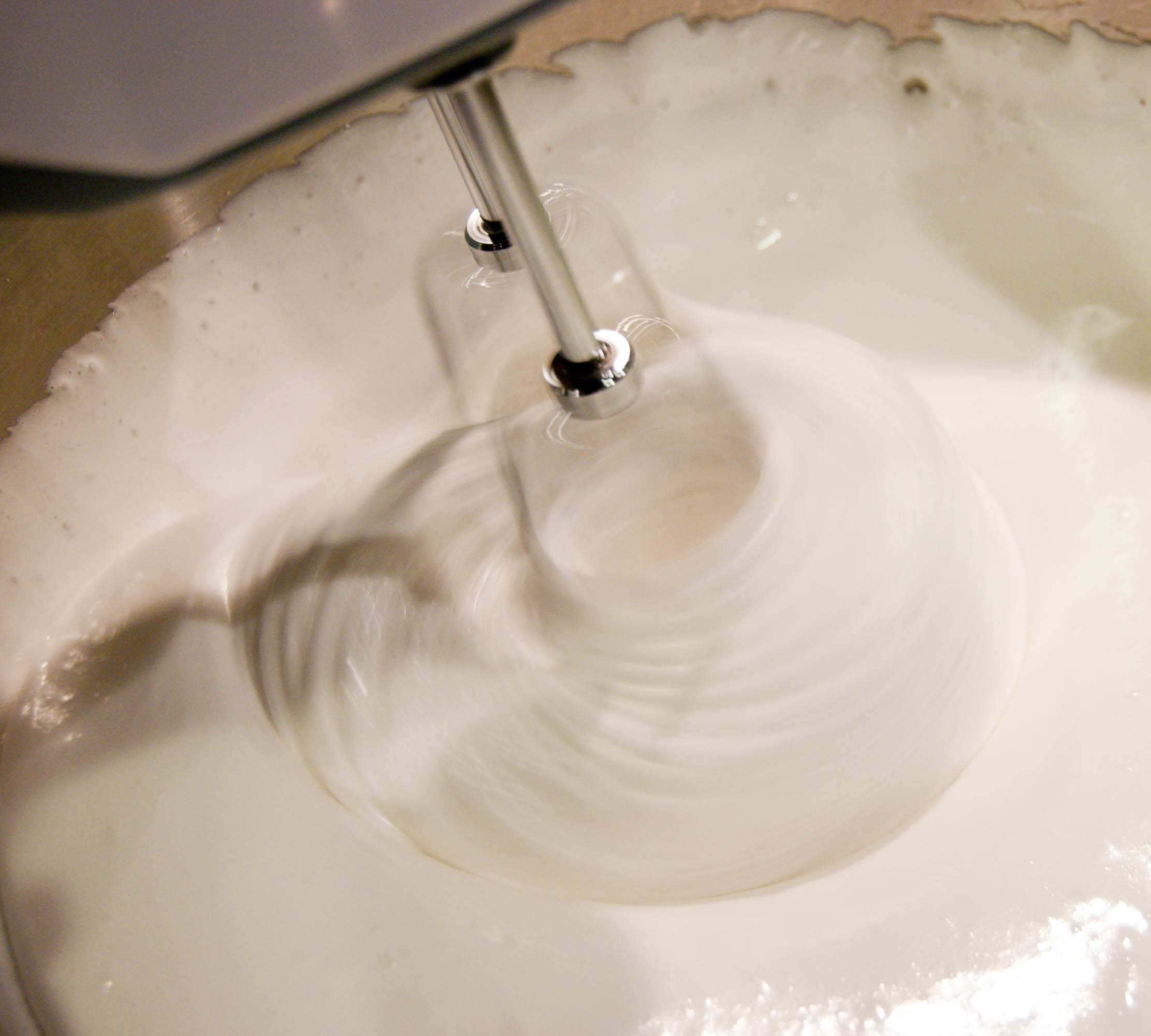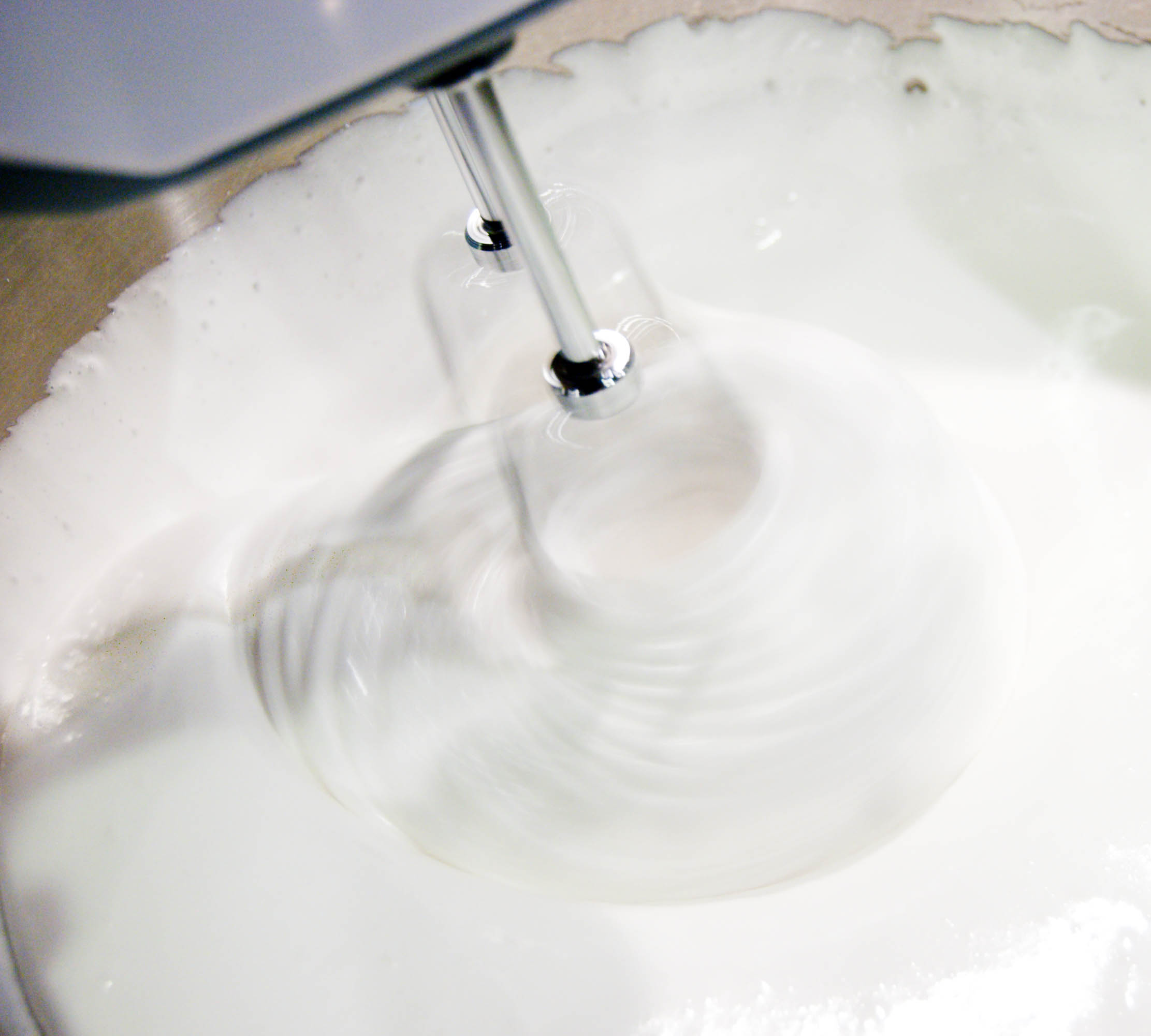 4. With an electric mixer (I used a hand-held) beat mixture on high speed until white, thick, and nearly tripled in volume, about 8 to 10 minutes.  (If you’re using a stand mixer, this will take less time — approximately 6 minutes.)
