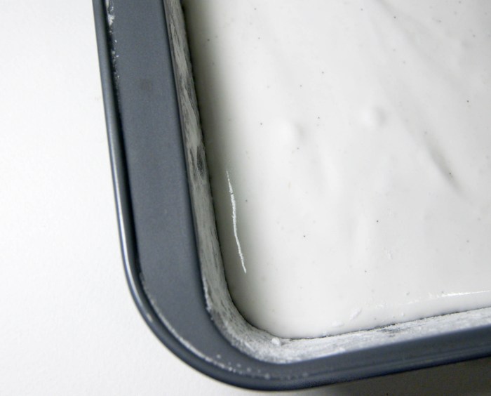 1. Oil bottom and sides of a 13″ x 9″ x 2″ rectangular metal baking pan and dust bottom and sides with some confectioners’ sugar.
