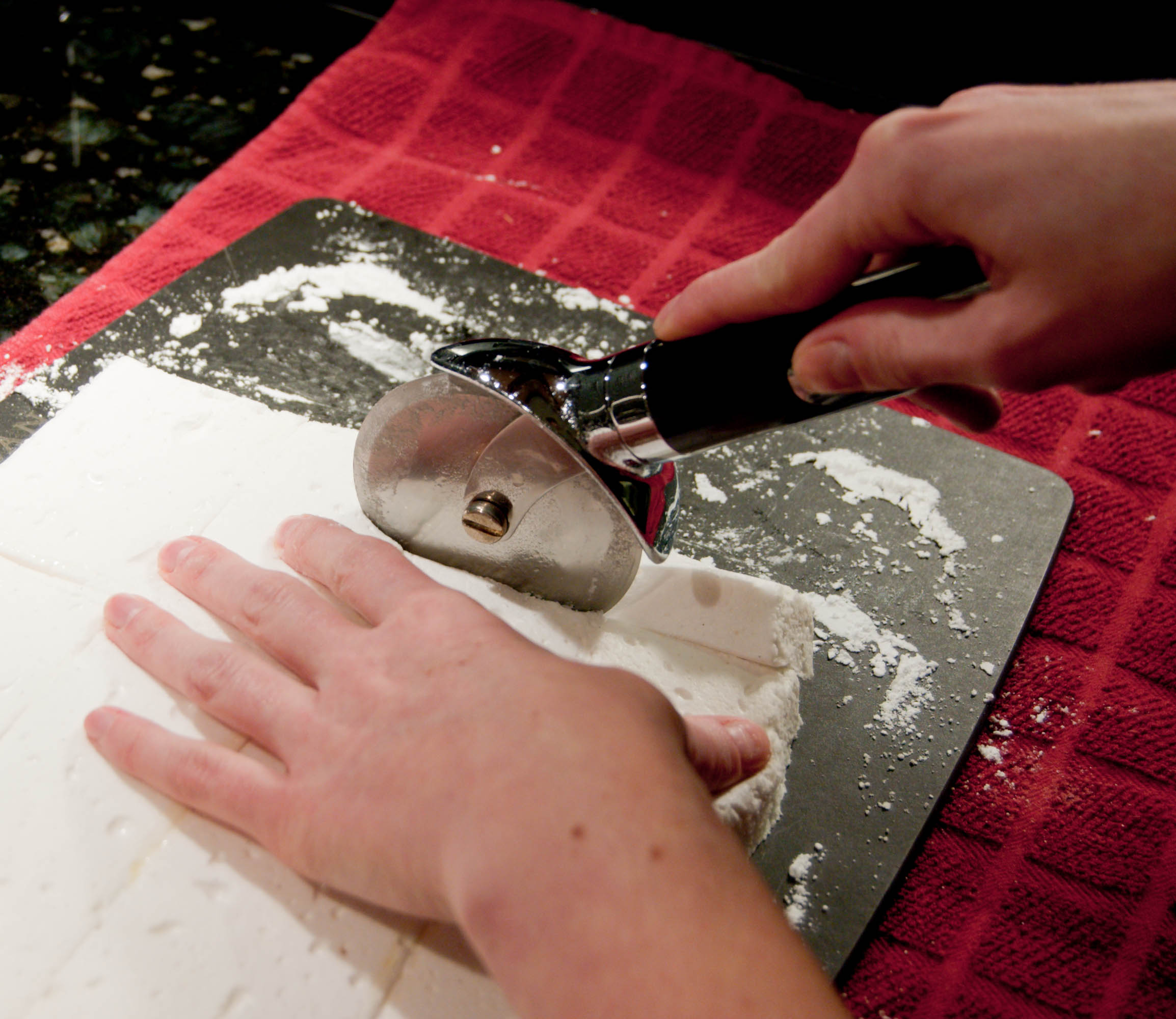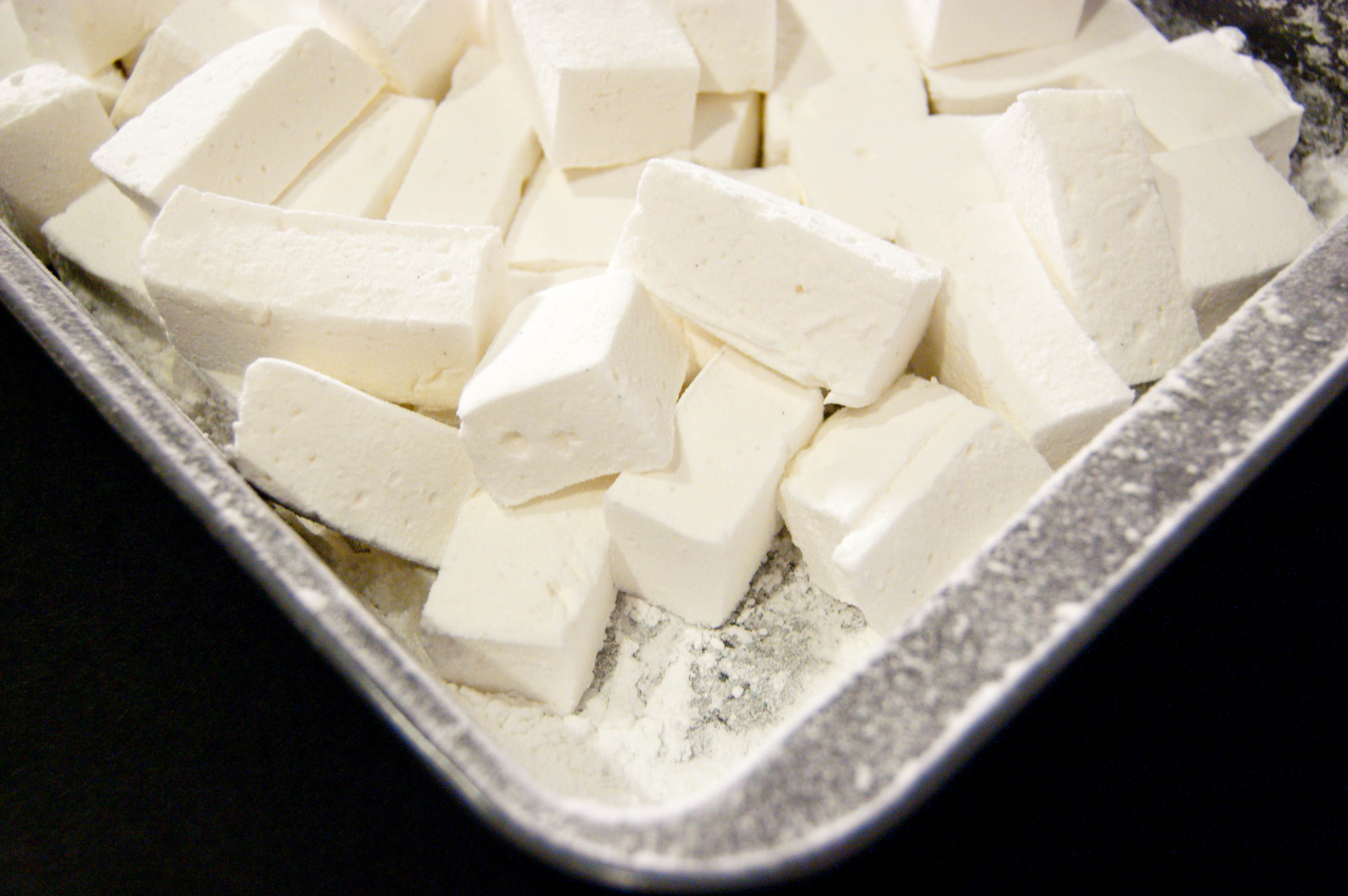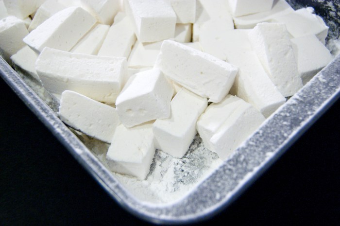 7. Using a greased pizza wheel, cut marshmallow into 1-inch cubes (or try to, anyway — mine are definitely off!). Return cut marshmallows to the pan and toss with an additional 1/4 cup of sifted confectioner’s sugar until well coated. Store marshmallows in a sealed container for up to one week.