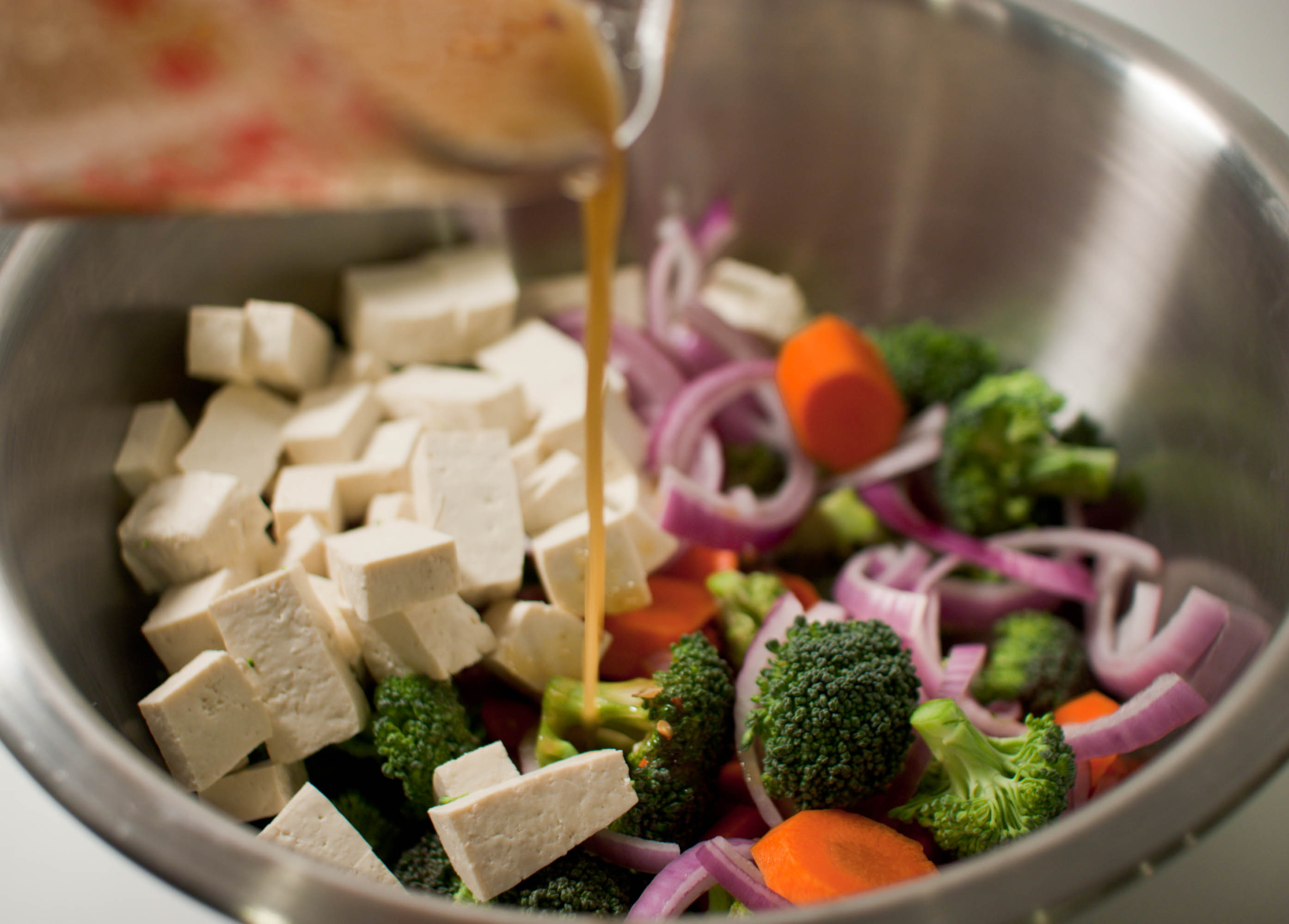2. In a large bowl, whisk together the ingredients for the citrus sauce. Add veggies and tofu (reserving almonds for later) and toss to coat. Spread mixture onto a shallow baking tray lined with foil and bake for 15 minutes. Add almonds and bake for another 10 minutes.
