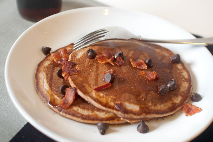 4. Serve each stack of pancakes with a sprinkling of bacon and chocolate chips. Top with warm maple syrup.