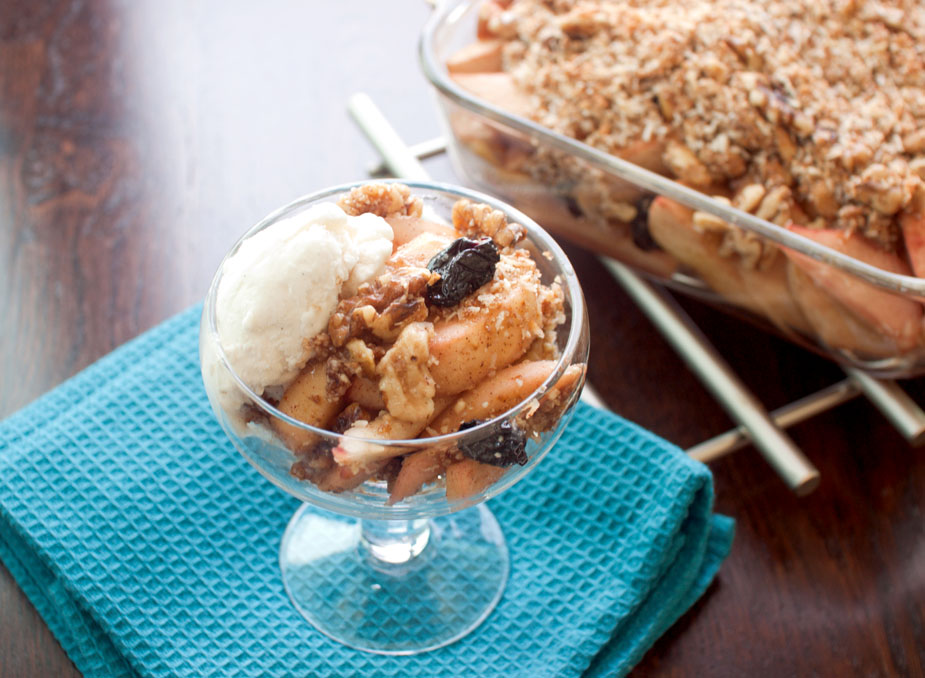 - For the crumble topping, mix all ingredients in a medium bowl. Sprinkle the topping over the fruit and bake for 20 to 25 minutes at 325 degrees, or until the topping is golden brown. Let cool for a few minutes before serving. Top with scoop of coconut milk ice cream (optional).