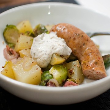 Sausages and Mustardy Roasted Potatoes with Brussels Sprouts and Bacon